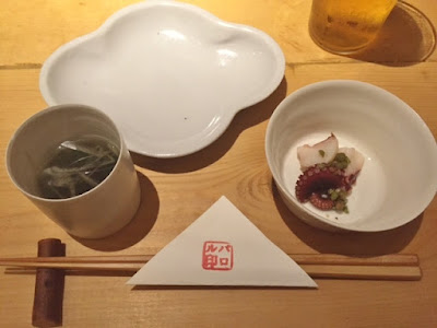 お通しは小吸い物とタコわさび。 器も、おお店のマークも、センスいい! |